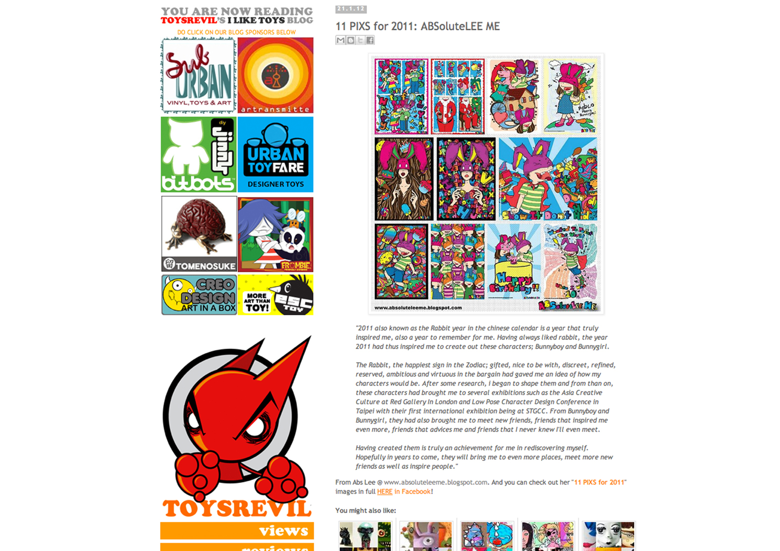 ABSoluteLEE ME© FEATURED IN TOYSREVIL, SINGAPORE BASED BLOG. A BLOG WHICH WAS AWARDED BEST BLOG FOR DESIGNER TOY IN 2011. CHECK OUT MY WRITE UP ON WHAT I THINK ABOUT 2011 IN TOYSREVIL!