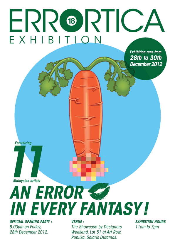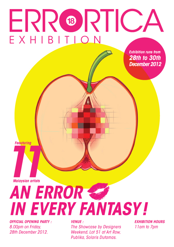 ERRORTICA IS A GROUP EXHIBITION FEATURING THE WORKS OF 12 MALAYSIAN ARTISTS; ABS LEE, APOH PAURINE, BEE TONG, CHERN, GUANYI MA, JAZZ TON, KENJI CHAI, SOPHIE, TINTOY CHUO, VICKY, MANMANTAN AND OUR SPECIALLY INVITED PASTRY ARTIST, WISLEY.